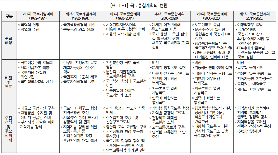 국토종합계획은 아래 표에 나타난바와 같이 4차에 걸쳐 세워졌으며 이번 계획은 5차에 해당합니다.