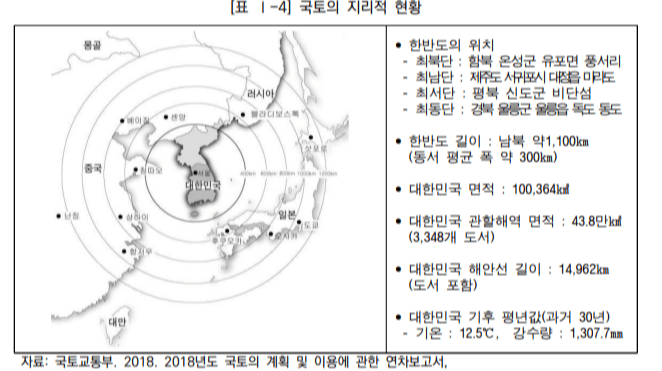 대한민국은 지리적으로 길이가 남북 약 1,100km, 동서 평균 약 300km입니다. 면적은 100,364k㎡이며 대한민국 관할 면적은 43.8만k㎡입니다. 해안선 길이는 14,962km, 관할하는 도서의 수는 3,348개입니다. 과거 30년간 평균 기온은 12.5℃, 강수량은 1,307.7mm입니다.