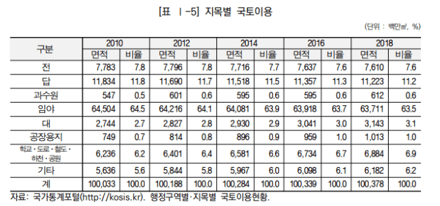 지목별 국토이용 현황을 보면 공장용지와 대지는 증가하고 전, 답은 감소하고 있습니다. 임야가 63.55, 농지 19.4%, 기타 도시적 용지가 11.0%를 차지합니다. 용도지역별로는 농림지역 46.5%, 관리지역 25.6%, 도시지역 16.6%, 자연환경 보전지역 11.3%입니다.