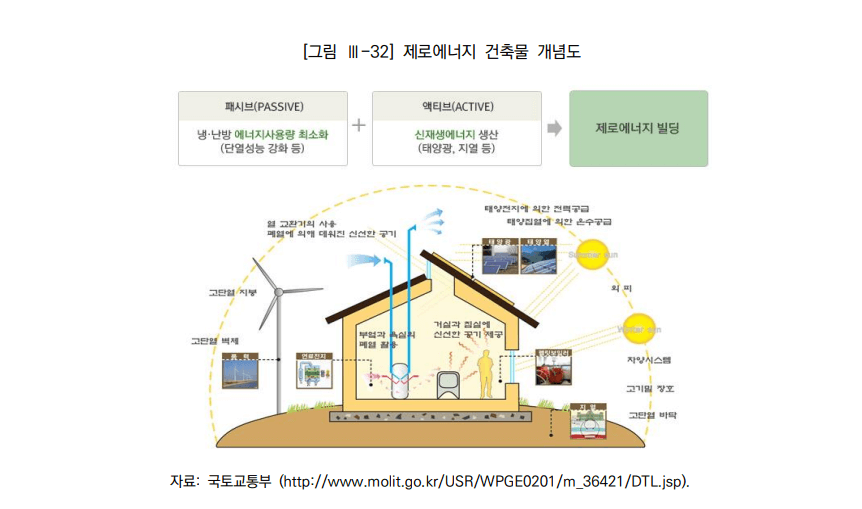 에너지 절감을 위한 제로에너지 건축물 개념도를 소개하였습니다.