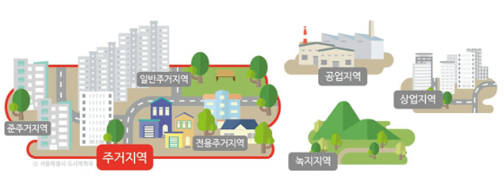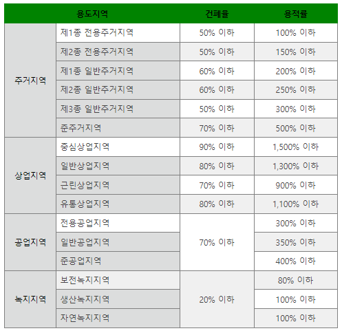 건폐율의 경우 수치가 높은 곳이 투자가치가 높은 것은 당연합니다. 그래서 최고 90% 건폐율이 적용되는 중심상업지역의 땅값이 가장 비싸게 됩니다. 또한 단독주택만 들어설 수 있는 전용주거지역보다는 향후 아파트 등 고층 주택을 건축할 수 있는 일반주거지역에 투자하는 것이 투자수익이 월등합니다.