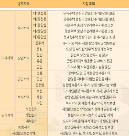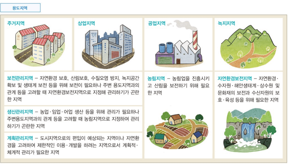 용도지역은 전국을 지정대상으로 하며 중복 지정이 불가능합니다. 용도지역은 해당 토지의 활용과 규제에 대한 가장 기본적인 구분으로서 그에 따라 건축물의 용도, 건폐율, 용적률, 높이 등이 구체적으로 제한됩니다. 도시지역, 관리지역, 농림지역, 자연환경보전지역으로 구분됩니다.