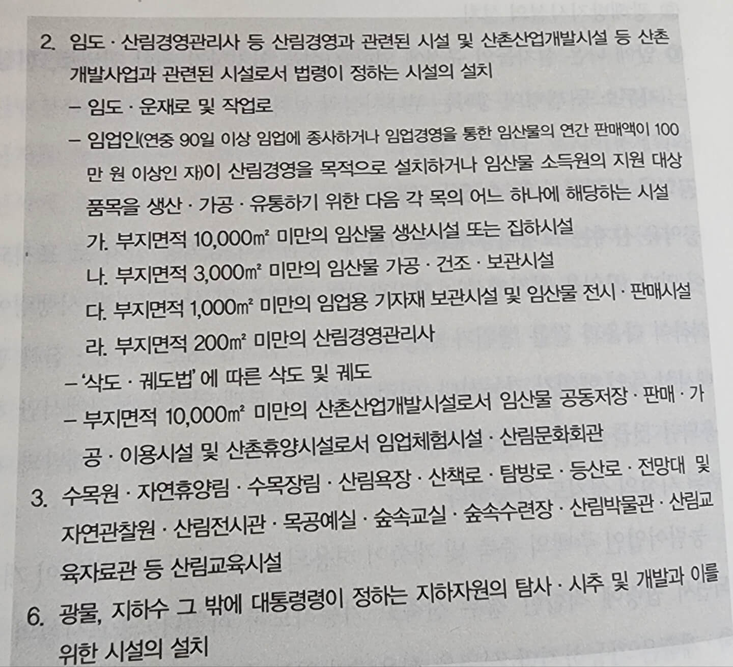 - 산촌개발사업과 관련된 시설로서 법령이 정하는 시설의 설치