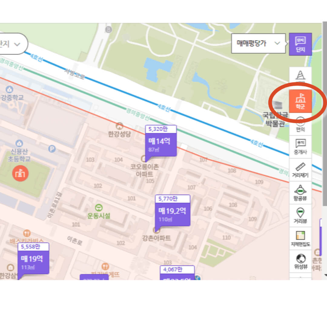 아파트 투자의 한 기준으로 초등학교와의 접근성을 살펴볼때 참조할 사이트는 네이버 부동산(land.naver.com)입니다. 네이버에서 아파트 이름을 검색한 후 네이버 부동산 메뉴에서 '초등학교 학군정보'를 살펴볼 수 있습니다. 지도에서 학교 모양 아이콘을 클릭 하면 인근 초등학교가 표시가 됩니다. 동일한 아파트에서도 단지에 따라 다른 초등학교가 배정되는데 이렇게 상세한 부분도 확인이 가능해서 유용합니다.