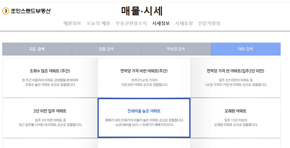 전세가비율을 확인하기 위해서는 중앙일보 부동산 전문인 조인스랜드(www.joinsland.com) 사이트를 참조하면 좋습니다. 메인 메뉴의 시세정보 > 테마 검색을 들어가면 전세비율 높은 아파트를 찾아볼 수 있습니다. 매매가 대비 전세 비율이 높을수록 적은 자본금으로 매입이 가능합니다. 예를 들어 전세가 비율이 90% 일 경우 매매가가 1억 원이 아파트는 내 자본금 1천만 원이 있으면 투자가 가능합니다.
