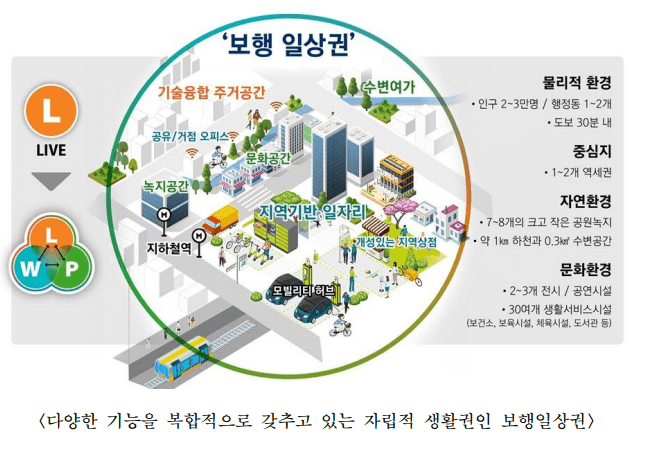 최근 달라진 생활양식 변화에 맞춰 '보행일상권' 개념을 새롭게 도입했습니다. 기존에는 주거지역과 일자리, 여가 공간이 분리되어 있었습니다. 그러나 재택근무를 통해 코로나19를 극복하고 나아가는 과정에서 주거뿐만 아니라 생활의 중심 공간으로서 일과 여가가 모두 가능한 자립적인 생활권으로 업그레이드한다는 계획입니다.