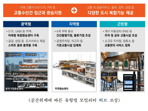용산, 삼성, 잠실등에는 UAM(Urban air mobility) 터미널을 설치합니다. UAM과 GTX, PM(개인이동수단)등 교통수단 간의 접근과 환승을 지원하고 연계하는 복합환승센터인 '모빌리티 허브'도 곳곳에 조성합니다. '모빌리티 허브'를 서울 전역에 구축하고 새로운 미래 교통 인프라를 서로 연계해 입체적인 교통도시를 완성한다는 계획입니다.