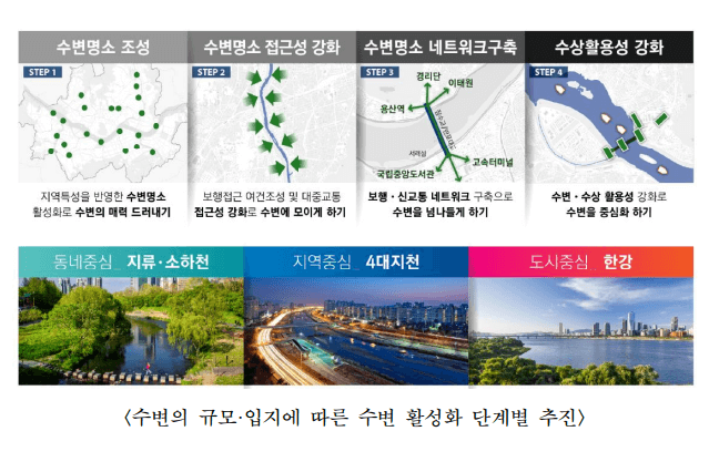 삶의 질 향상의 구심점으로 서울의 61개 하천을 활용합니다. 하천의 물길과 잠재력을 이끌어내 수변활성도를 높입니다. 동네의 소하천과 지류는 수변카페와 쉼터등 일상 속 수변친화 공간으로 발굴하고 지역 중심의 안양천, 중랑천, 홍제천, 탄천의 4개 지천은 배후 주거지와의 접근성을 높여 특성화를 높입니다. 도시중심의 한강은 여의도, 압구정등 한강변의 대규모 정비사업과 연결시켜 한강수변문화 네트워크를 구축한다는 목표입니다.