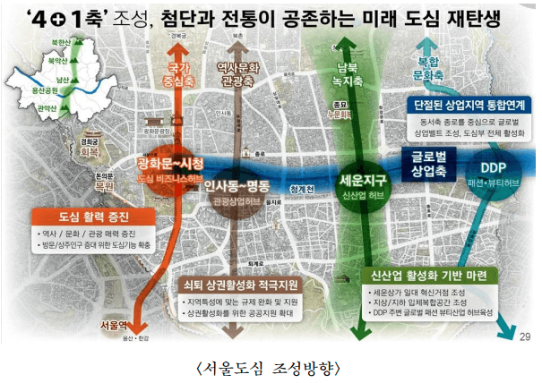 서울 도심이 보존위주의 정책으로 그동안 성장이 둔화되었다면 첨단과 전통이 공존하는 미래 도심으로 전환시켜 남북 4대 축과 동서방향의 축을 중심으로 서울도심 전체를 활성화하겠다는 계획입니다.